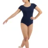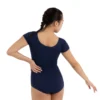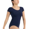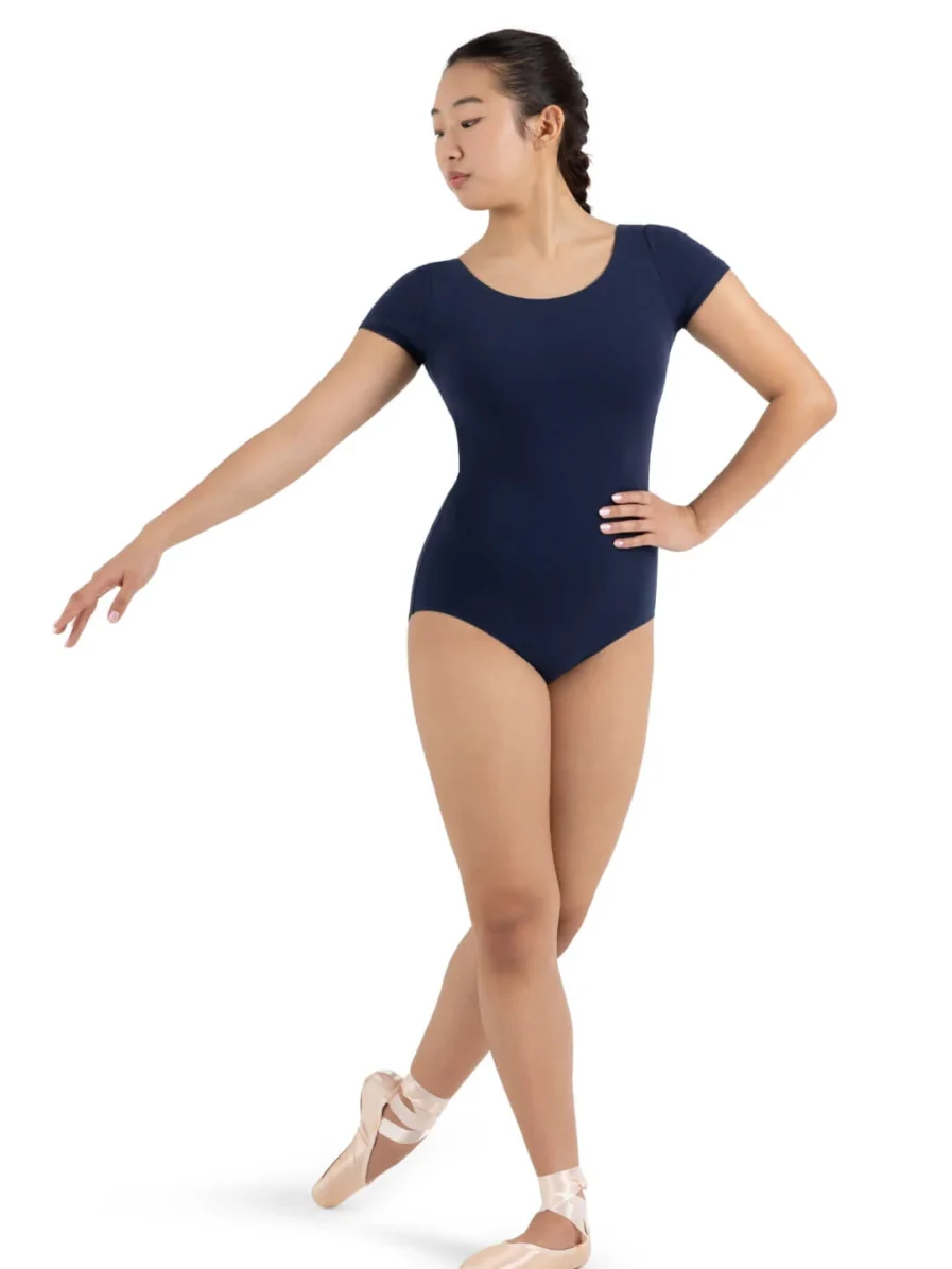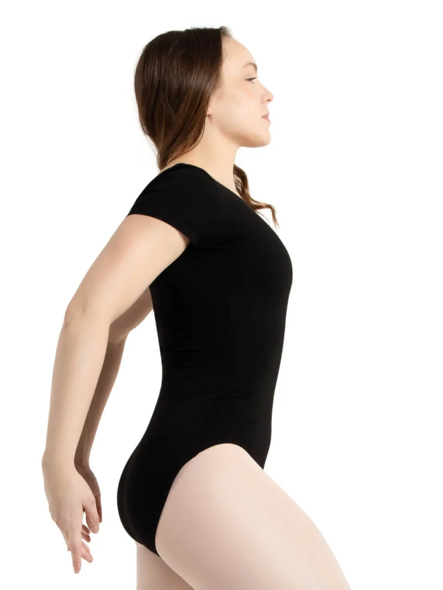 The Short Sleeve Cotton Leotard creates a simple silhouette that is optimal for studio time, rehearsals, and under joggers for an everyday look. This leotard features a classic scoop front and back. Made of a soft cotton and spandex blend that is resilient. Available in both adult and child sizes.